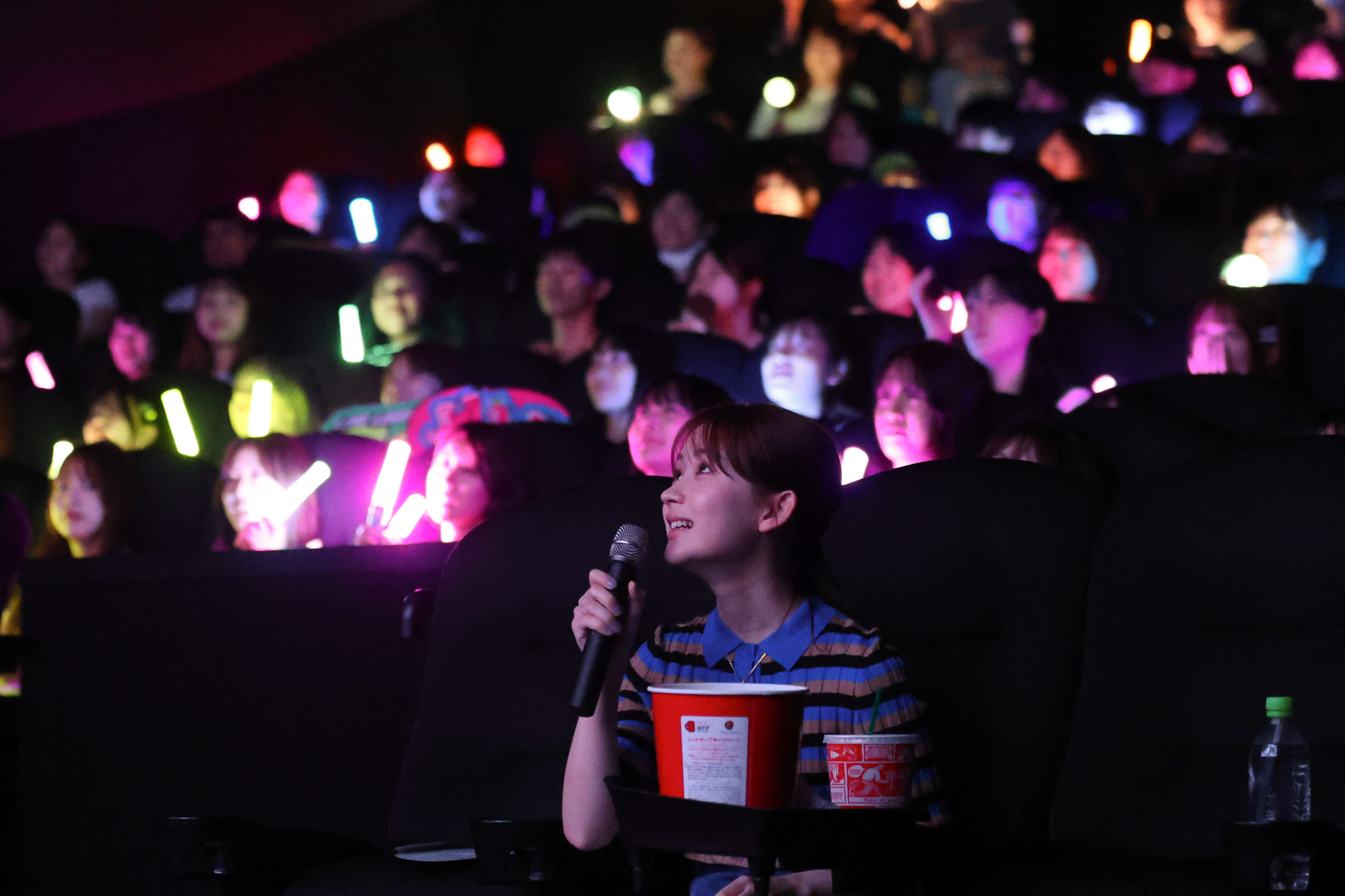 そしてその後はいよいよ映画の上映がスタート! ポップコーンとドリンクが用意された最前列のシートに座った畑は、マイクを手に「本当に楽しみだね。一緒に映画を観よう!」とワクワクが止まらない様子。映画のオープニングでLiKE LEGEND が繰り広げるライブシーンが映し出されると「皇太! 叶翔! 晴! 優生! 一生!」とひとりひとりのメンバーの名前を呼び続け、拍手とともに「ライクレ!」コールで早くも大盛り上がり。会場全体が早くも一体感に包まれる中、ところどころで「みんな時間がない中でダンス練習をがんばっていたんですよ」といった具合に、撮影の裏話を披露するなど、映画のヒロインと一緒に映画を鑑賞するという貴重な機会に、会場の観客もすっかり魅了されている様子。そして物語がクライマックスに向けて最高潮の盛り上がりを見せると、ライクレメンバーを鼓舞するように「がんばれ!」と会場の応援もヒートアップ。そして映画が大団円を迎え、最後にライクレの楽曲「YOU ARE SPECiAL」が流れると、畑たちもメンバーコールを織り交ぜながら最後の応援。終始、興奮冷めやらぬ様子の会場内だった。