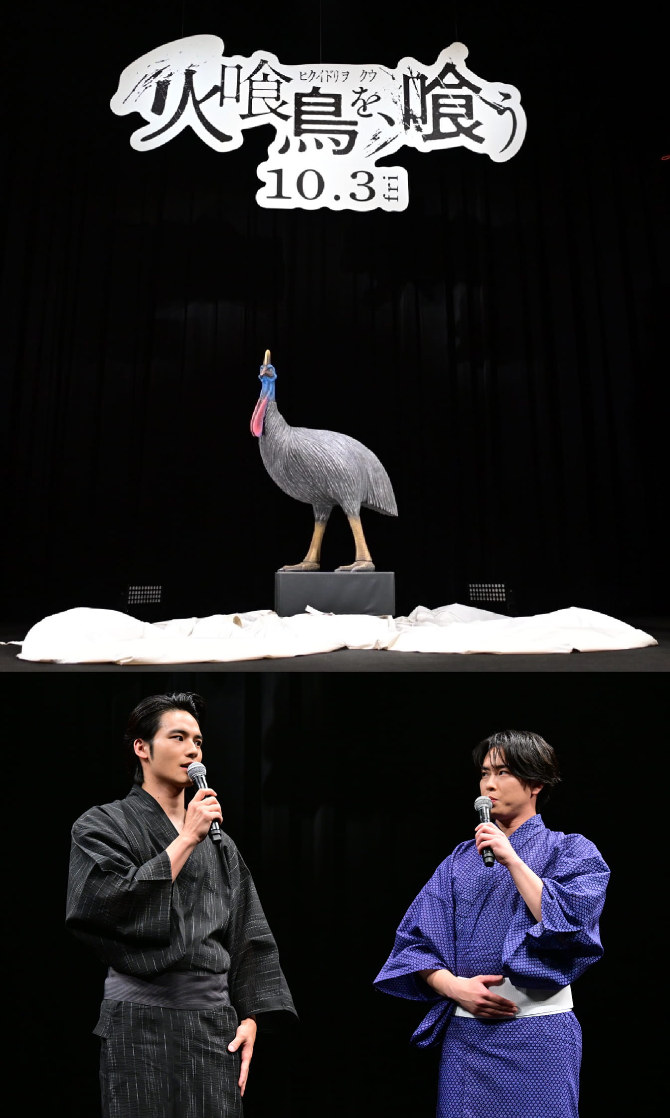 そんな中、さらなるスペシャルゲストが登場!運び込まれたのは大きな卵型の真っ白な巨大バルーン!?これに水上と宮舘は「白玉か?」と冗談めかすも、観客を巻き込んだ「ヒクイドリ、美味ナリ~!」のコール&レスポンスで卵型バルーンがはじけると、中から出現したのは原寸大の火喰鳥(※模型)だった。リアルな作りながらも、大掛かりな演出で御披露目というシュールな展開に登壇者たちは耐えきれず大笑い。水上は「どこにお金をかけているんですか!?スゲー!」と大はしゃぎだった。