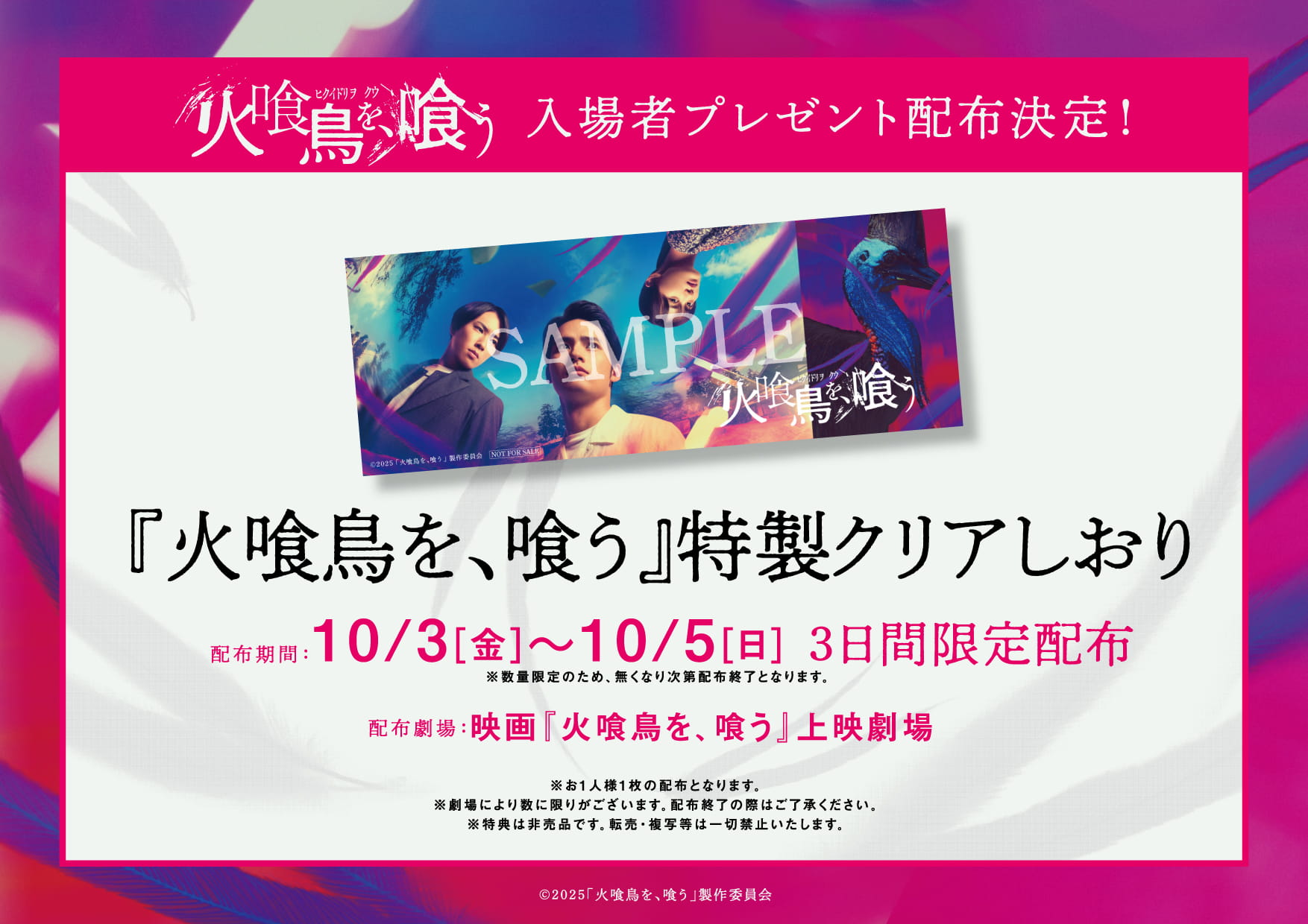 配布期間:10月3日(金)~10月5日(日)3日間限定配布 ※数量限定のため、無くなり次第配布終了となります。 配布劇場:映画『火喰鳥を、喰う』上映劇場 ※お1人様1枚の配布となります。 ※劇場により数に限りがございます。配布終了の際はご了承ください。 ※特典は非売品です。転売・複写等は一切禁止いたします。