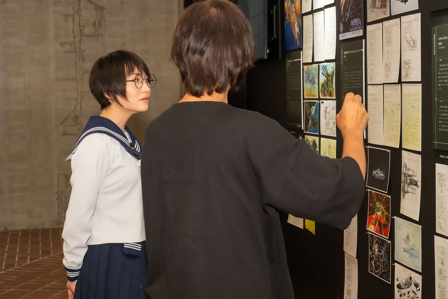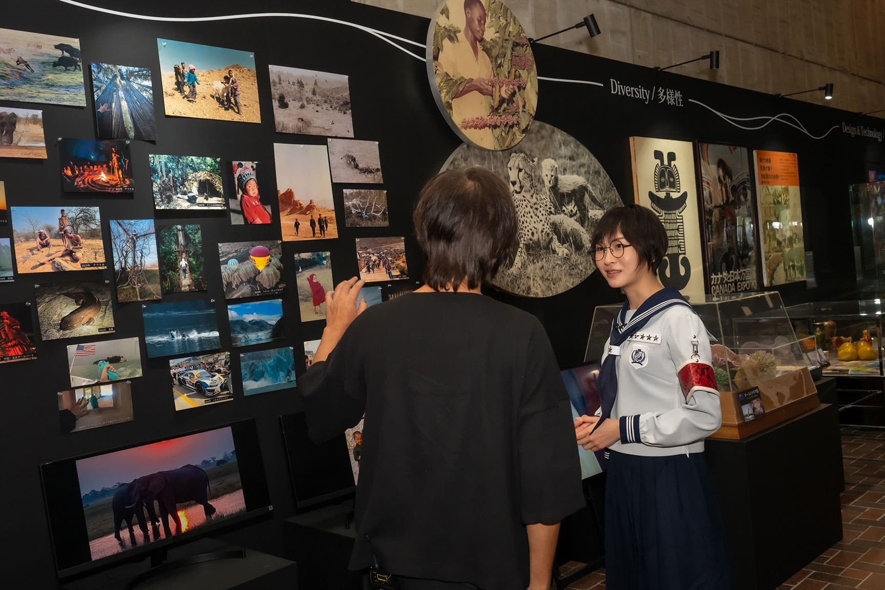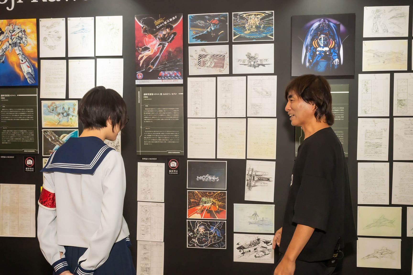 さらに一行は、万博記念公園での「EXPO’70 パビリオン企画展 河森正治 創作展~万博・合体・変形・未来~」も訪問。1970年の「日本万国博覧会(大阪万博)」を体験したことが現在の創作活動に結びついている河森監督が、SUZUKAを案内。当時の万博体験が再現された展示物ほか、河森監督が訪れた世界各国の写真、過去作の作画などが鑑賞できる同展。河森監督は展示写真を指し、「20代くらいの頃から、“インスピレーションハンティング”としていろんなところに行きました」とさまざまな国や地域で暮らす人との交流や、そこで見た動物たちのことを回想。それらで得た刺激や疑問が各作品にも生かされていると明かした。