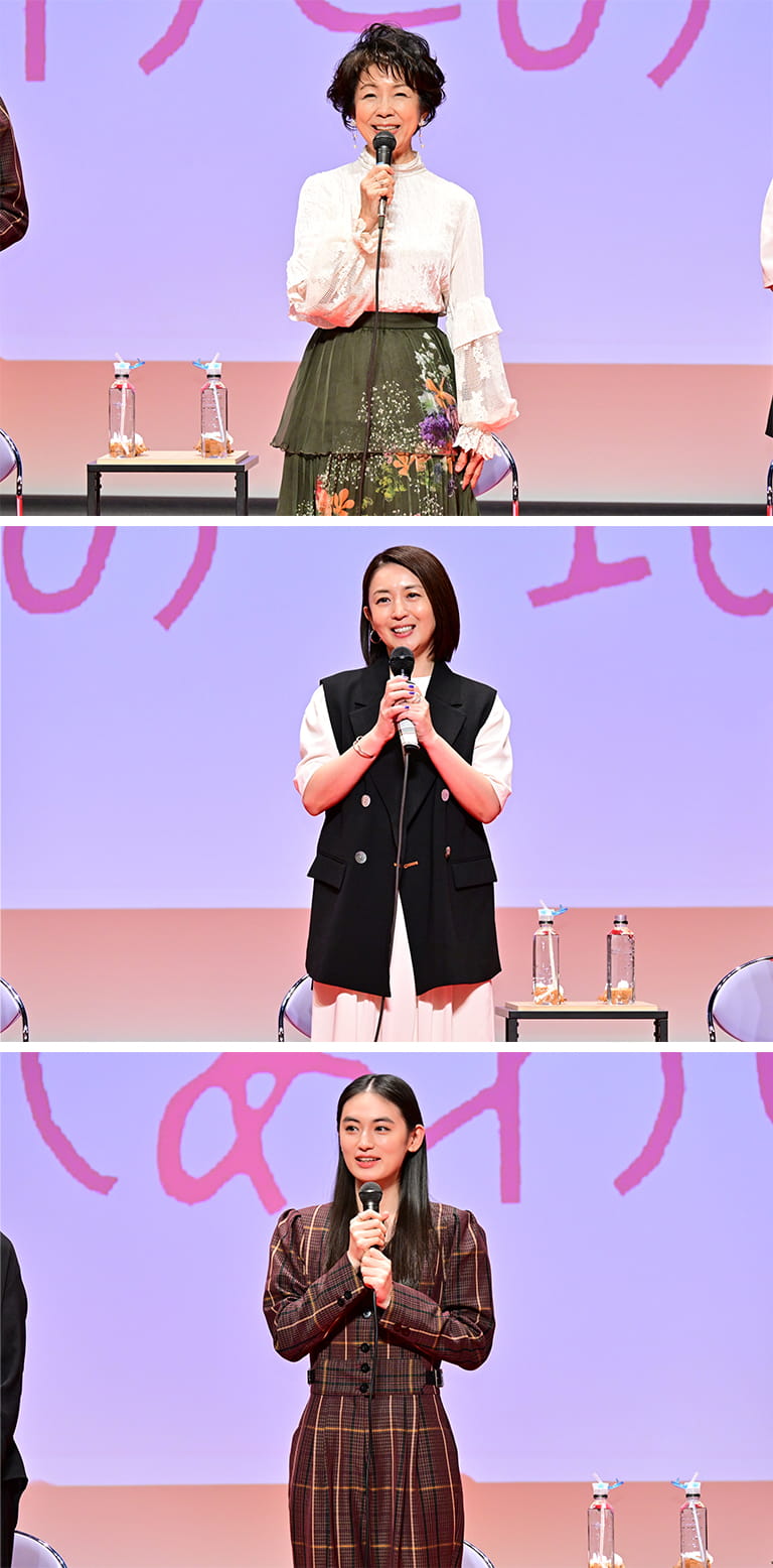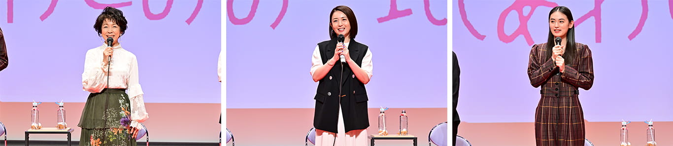 市毛と酒井は母娘という役柄、八木は酒井演じる綾の息子・拓磨(豆原)の恋人という設定。三世代をそれぞれ演じている。本作出演の経緯について市毛は「前向きなお話しで、学びがテーマという所も良くて。是非!と思いました」と即答したようで、酒井も「バリキャリのシングルマザーという、今までそんなお母さんを演じたことがなくて新鮮で素敵だと思った。そして作品全体の学びというテーマも素晴らしいと思いました」と回想。八木は「脚本が素晴らしく物語全体に温かいものが流れていて、素敵な作品に参加できるのが嬉しかった」と笑顔を見せた。